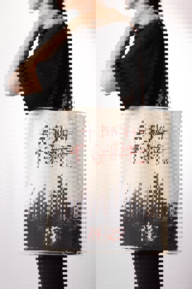 The "A Bunch of Stuff Skyline" tote bag celebrates the exhibition's debut city and features durable natural materials, a black strap and a printed design. Perfect for carrying your everyday essentials, it's the perfect blend of art and practicality.