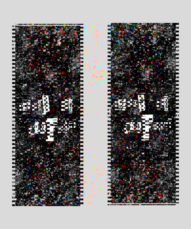 The "Death by Confetti" poster is inspired by the skeleton-strewn painting series of the same name. As a critique of the oppressive (and often soul-draining) atmosphere of Hollywood and the paparazzi, Johnny's psychedelic confetti can be interpreted as the barrage of flash from countless paparazzi, or the sugar-coated, artificial promise of the Hollywood Dream, both of which inevitably lead to the skeleton's internal and external collapse. The painting's darkly comedic nature is hinted at through the gothic lettering and the pitch-black, gaping spaces.