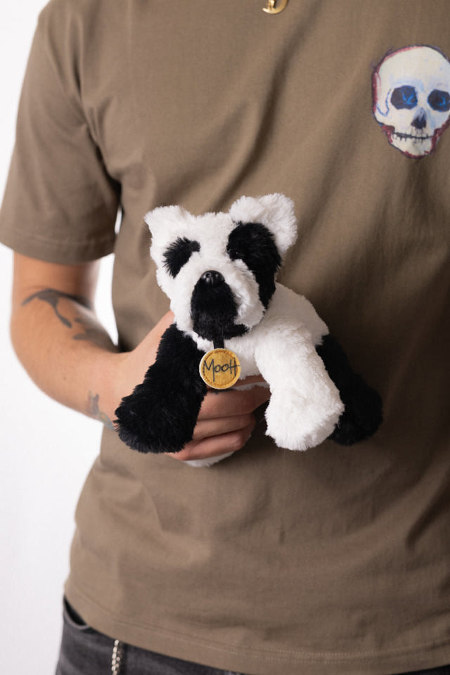 Mini Moo, a soft plush toy, is an adorable replica of Johnny's beloved pit bull boxer terrier, and he has immortalised Moo in a painting of the same name, lounging in a majestic, sun-dappled field of poppies, making him the central motif of the exhibition.