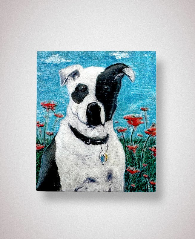 This handcrafted 3D resin magnet depicts Johnny's beloved pit bull/boxer terrier, Moo, who he immortalized in a painting of the same name. Relaxing in a field of majestic poppies bathed in sunlight, Moo is a dreamy, idyllic tribute to his beloved.