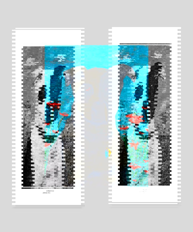 This print depicts Johnny's beloved family dog, Moo, and he has immortalized his love for the pit bull/boxer terrier in this large painting.