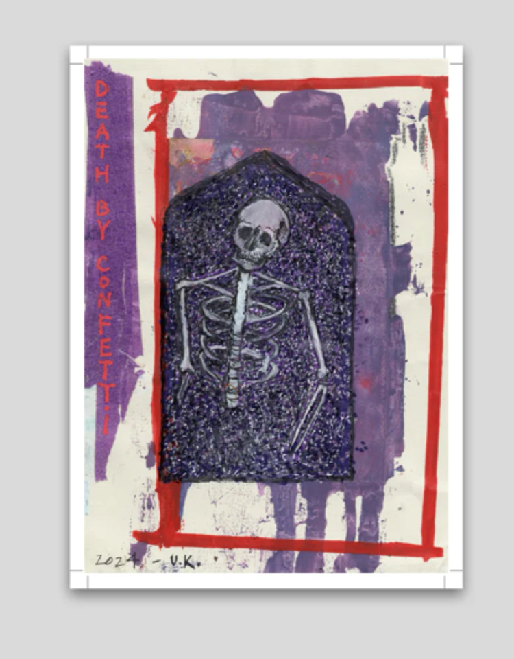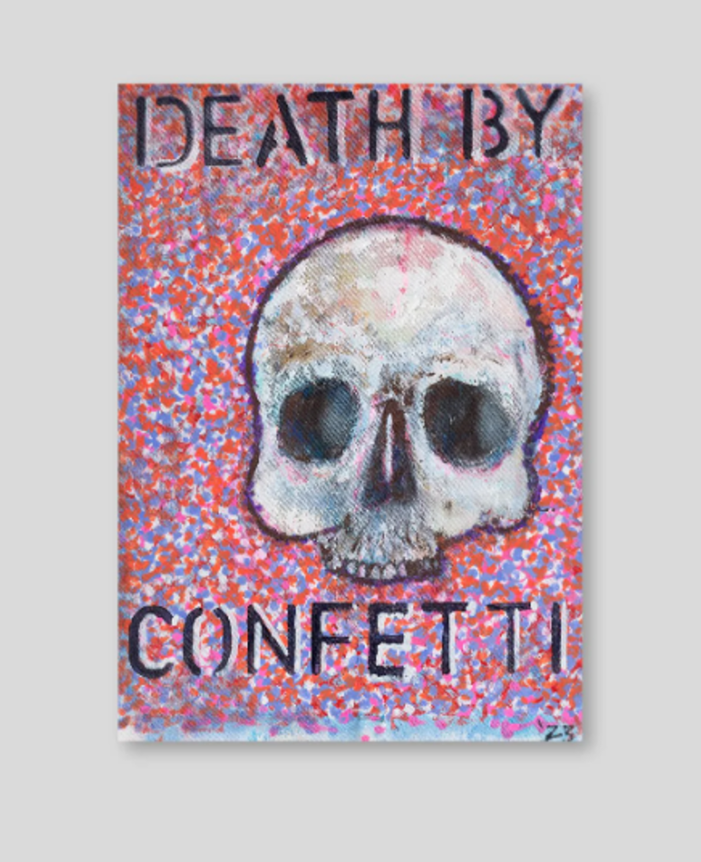 ジョニー・デップの「Death By Confetti」シリーズに属する本作は、彼のトレードマークである紙吹雪を用いた点描技法を特徴としています。布地という素材を革新的に用いた2024年の原画を基に制作されました。